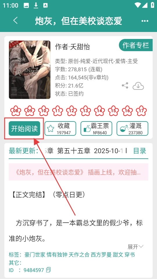 1、打开书城页面,选择想看的小说,比如【炮灰,但在美校谈恋爱】,进入小说详情页面,准备听书啦。