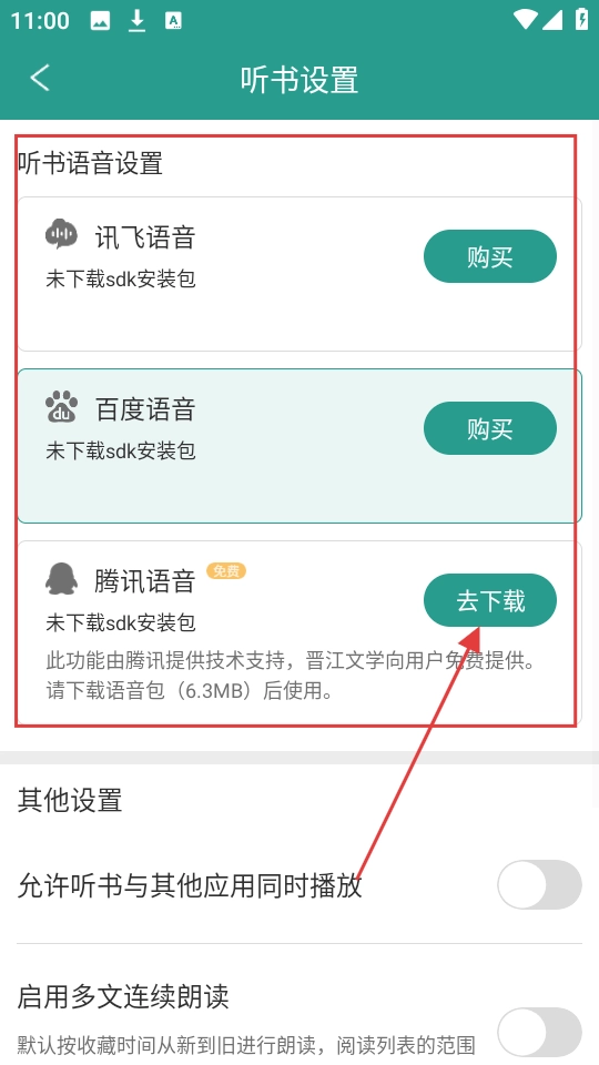 4、在听书设置页面,选择合适的听书语音,如腾讯语音,点击【去】按钮,后即可使用该语音听书啦。