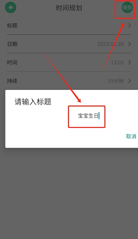 3、最上面给倒计时起个名字方便记,都弄好了点右上角保存就行,到时间会提醒你。