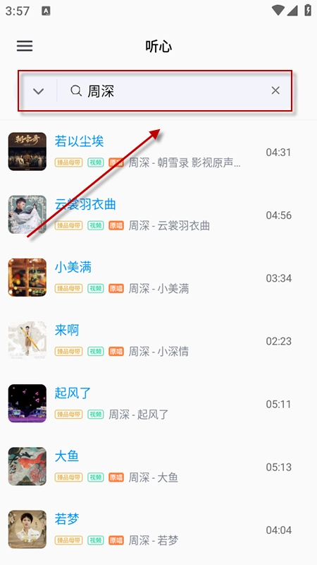 1.启动心听App,进入应用后在首页的搜索框中输入歌曲名称或者歌手名字