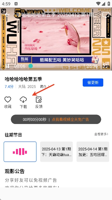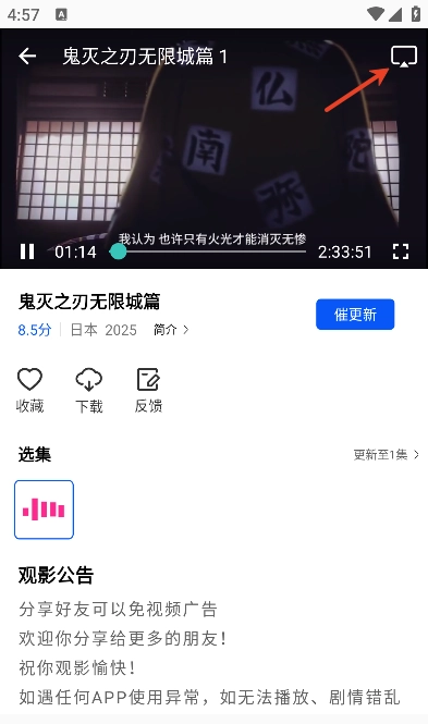 2、在播放详情页,点击箭头所指;