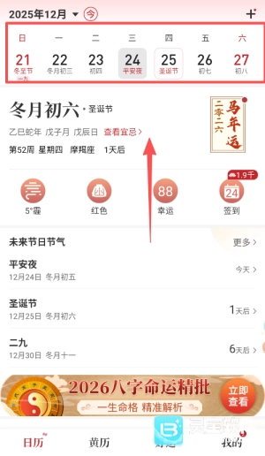 2、查看老黄历时,可通过左右滑动切换日期;宜忌事项采用不同颜色标注,清晰直观,一目了然。