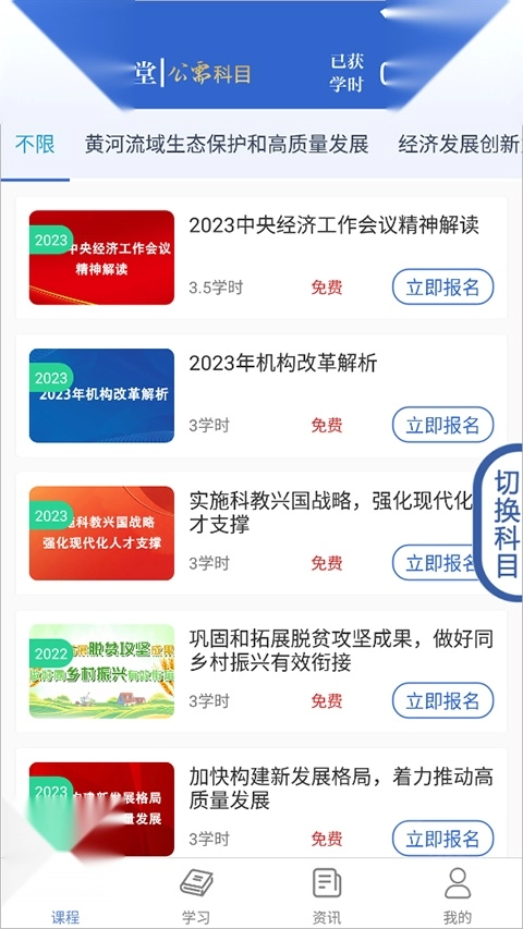 2、然后进入“课程”页面可以选自己想要的科目,点击“立即报名”。