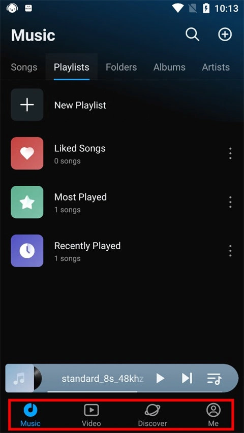 我们进入Lark Player 当中,软件目前还不支持中文,默认英文,不过里面的操作并不难,和大家平时用的音乐播放器差不多, 当我们刚进入到软件共有四个板块,音乐、视频、发现、我的。