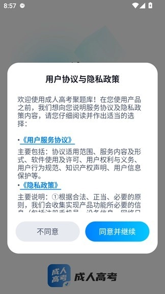 1、请在本页面下载并安装成人高考聚题库应用,首次打开应用时,请仔细阅读并同意隐私政策。