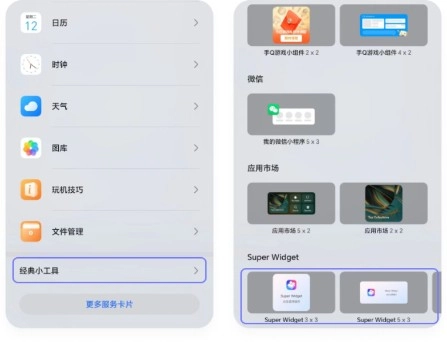 2、下滑找到【经典小工具】,点击【经典小工具】,然后在列表中找到WidgetHub,选择小组件尺寸,点击或拖动小组件到桌面。