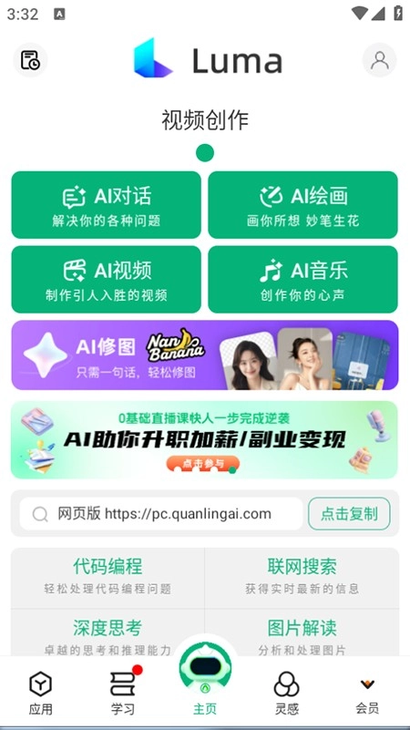 在本站内完成软件的安装与启动后,进行账号注册并登录。进入软件首页,您会看到AI对话、AI绘画、AI视频、AI音乐等多种AI功能模块,可根据需求选择使用。