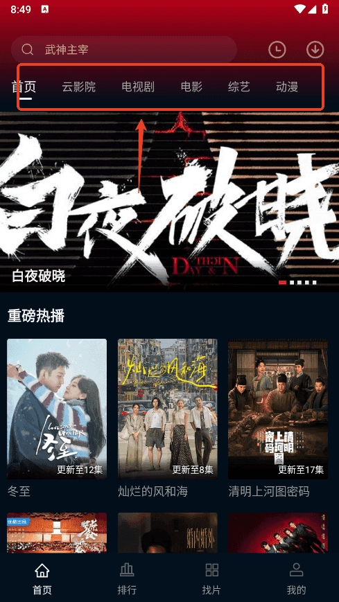 进入双鱼视频后,能看到云影院、电视剧、电影、综艺、动漫这五大栏目。