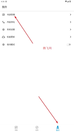 1、进入蓝鲸阅读后,在我的栏目中,点击书源管理;