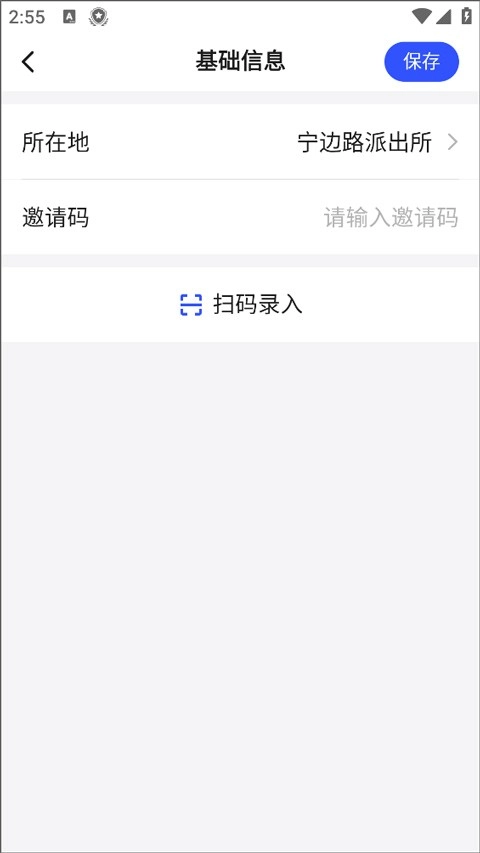 3、在基础信息页面用户选择所在地,输入邀请码或扫码录入即可完成注册。