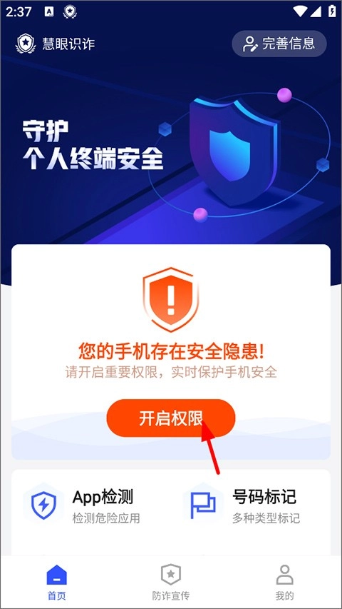 1、用户完成登录后,在首页找到并点击开启权限的按钮。