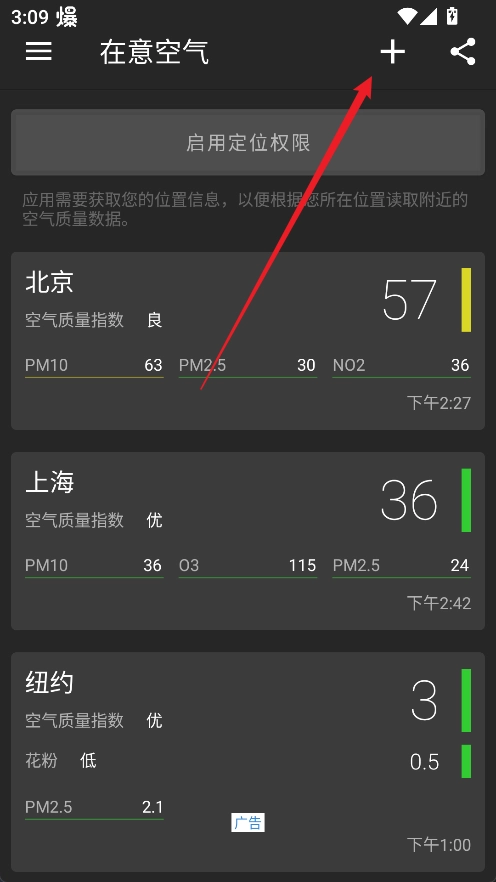 1、启动在意空气应用程序,接着点击首页右上角的“+”图标。
