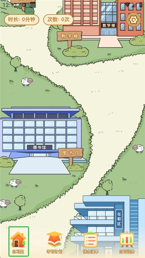 1、进入自律自习室2025后,用户可通过下滑操作挑选自习场景,具体包含教学楼、图书馆、在职区和私人自习室这几个选项。