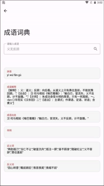 只要在输入框中搜索想要查询的成语,就可以了解它的拼音、成语解释、出处以及近义词等。