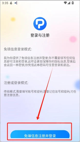 2、点击右下角“我的”,然后点击“免填信息注册并登录”