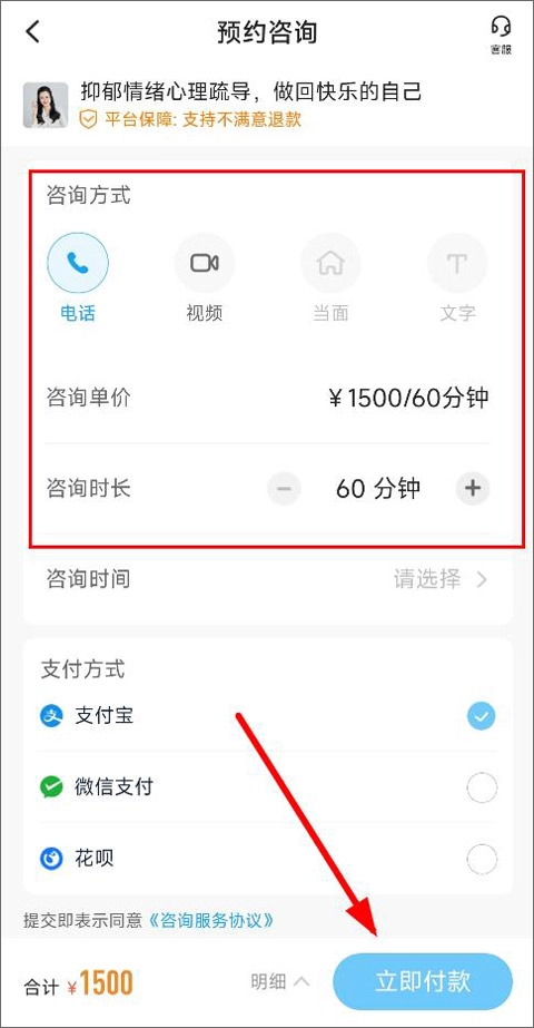 4、用户可依据自身实际情况,挑选预约咨询服务的主题,选定咨询方式(电话、视频)、服务单价以及具体时间,完成付款后即可成功预约。