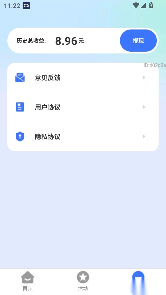 3.之后找到“我的”功能菜单栏界面底部的“提现”按钮点击进入