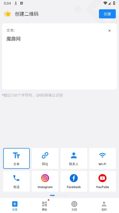4、填写完之后点击右上角的“创建”即可生成专属二维码