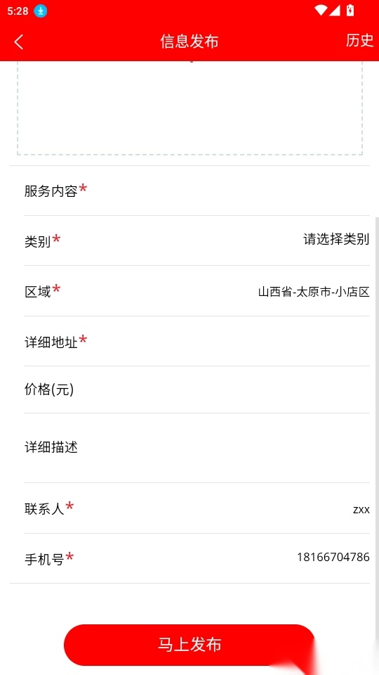 5.最后就可以将你要发布的服务信息进行详细编辑后点击“马上发布”即可