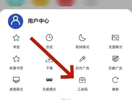 首先打开X浏览器,进入用户中心,点击【工具箱】。