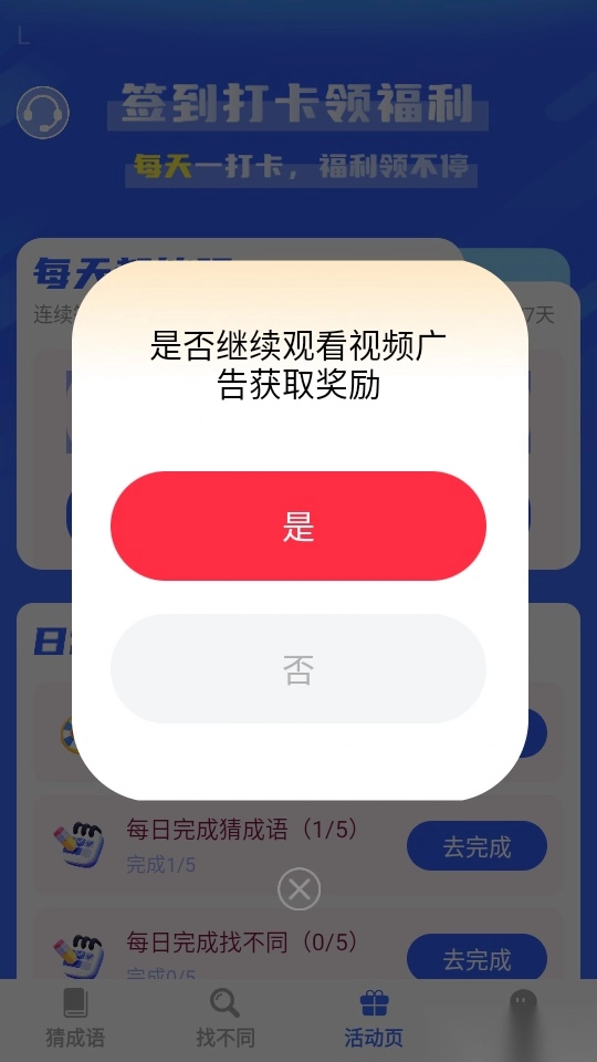 2、在软件的猜成语界面下方菜单栏中找到“活动页”按钮来点击进入。