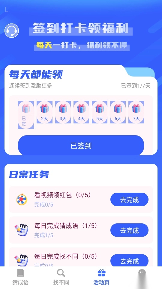 展示了关于用户每天的日常任务,能够对相关的趣味任务来一键完成,实时完成每天的任务。
