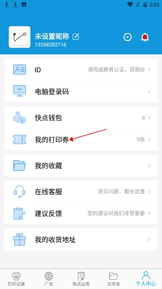 1、首先打开快点云打印应用,完成登录操作后,进入【个人中心】页面。