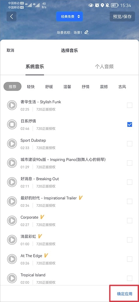4、用户可以选择系统音乐或者个人音频,系统音乐包含轻快、舒缓、温馨、古风等类型音乐,个人音频则需要玩家自行上传个人音频后才可以使用,选择合适的音乐后点击右下角确定应用