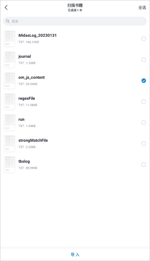 2、你可以从文件夹选择或直接使用右上方的扫描功能,扫描书籍会更方便,扫描出来后,选择你要导入的书籍点击导入即可。