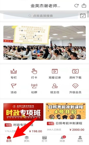 2.首页展示课程、打卡、、社群等入口,丰富学习资源一目了然。
