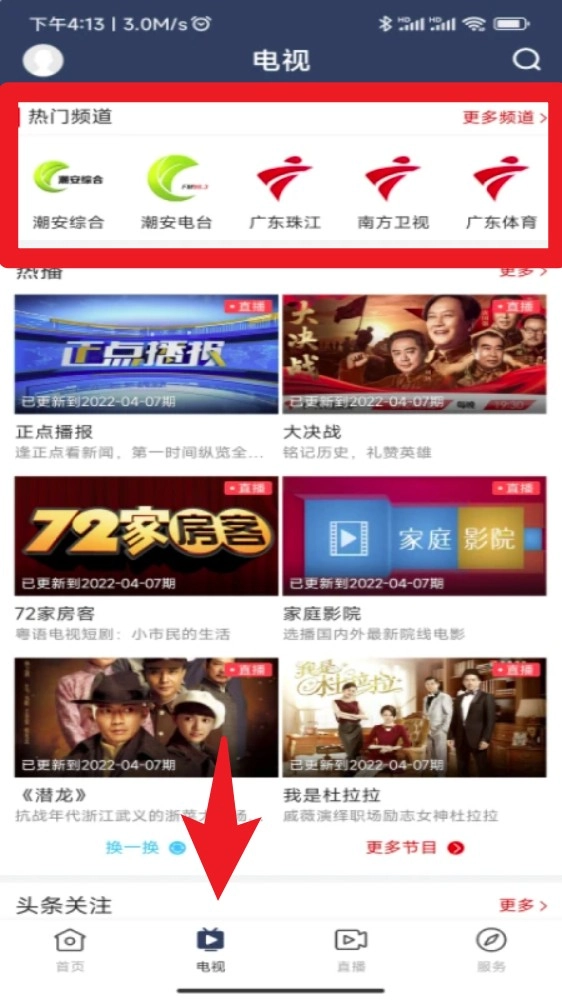 2.切换到底部电视页面,浏览潮安综合、潮安电台等频道,点击任意图标即可开始观看直播节目。
