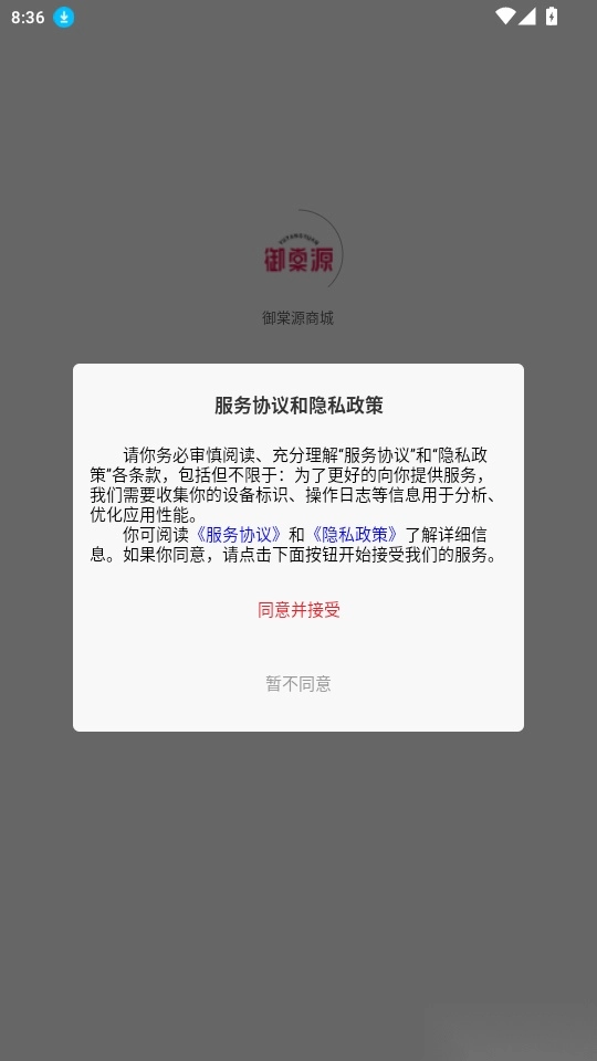 1.打开软件阅读“服务协议和隐私政策”点击“同意并接受”进入