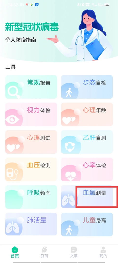 1、点击进入软件首页,这里为用户配备了多种工具,像血压检测、心率体验、乙肝自测、血压测量等功能都包含在内,我们选择点击血压测量;