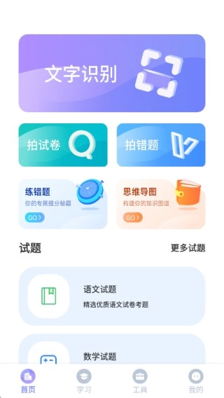 首页集成了文字识别、试卷拍摄、错题拍摄、错题练习、思维导图及试题等多项功能。
