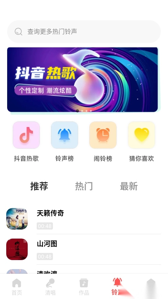 汇聚超多音乐作为铃声选择,包括抖音热歌、铃声榜、闹铃榜等分类,还能根据喜好推荐,支持设置铃声、闹钟,为生活增添音乐色彩。