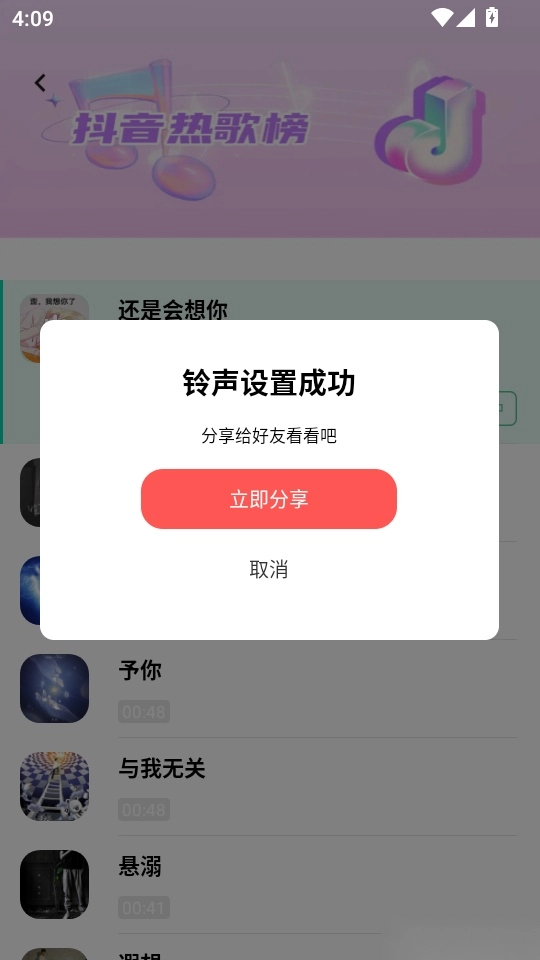 6.最后会出现“铃声设置成功”弹窗提示,可以点击“立即分享”按钮给好友
