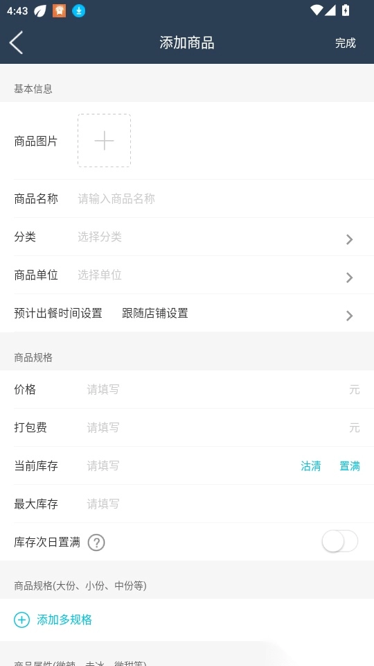 5.最后将商品的图片上传填写商品规格参数信息点击“完成”即可添加商品