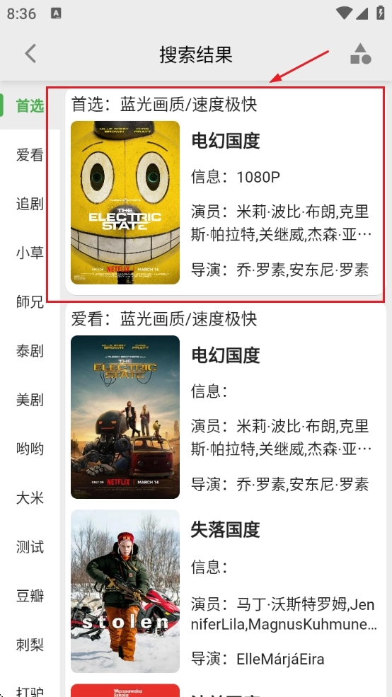 2、点击搜索后,会显示所有影视源的相关结果。