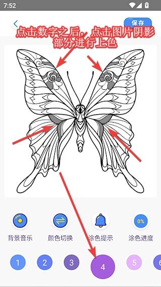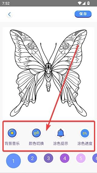 3、以蝴蝶为例,左下角工具栏提供了丰富的工具,背景音乐可以在您涂色的时候听音乐缓解压力