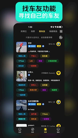 2、 "标签碰撞"推荐机制独具特色,系统会智能推荐不同标签群体间的互动机会。如博主与车主标签群体的跨界交流,激发新的社交可能性与话题创新。