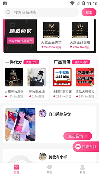 1、一款聚合优质美妆货源的批发软件,拥有海量一手货源,支持一件代发服务。