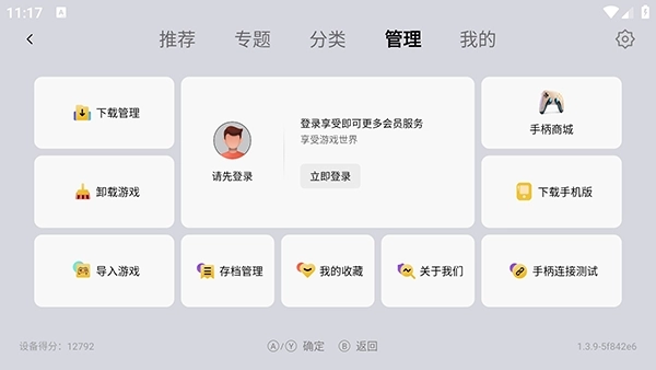 2、右上角的四个图标分别代表“网络状态”、“手柄连接状态”、“虚拟手柄连接状态”、“内存卡剩余容量”,若图标是白色则代表已连接上,灰色则是未连接的状态。3、若要连接手柄的用户可以在【管理】界面中点击进入“手柄连接”项目。手柄连接成功了之后,左下角会出现如下图的小手柄图标。