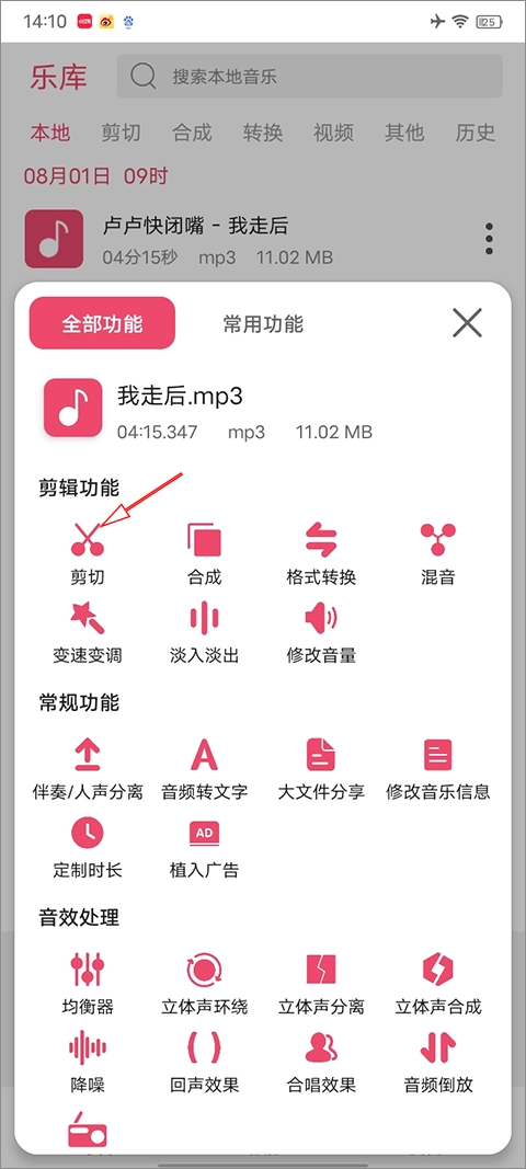 2、在弹出选项中选择“剪切”功能,准备进入音频裁剪界面。
