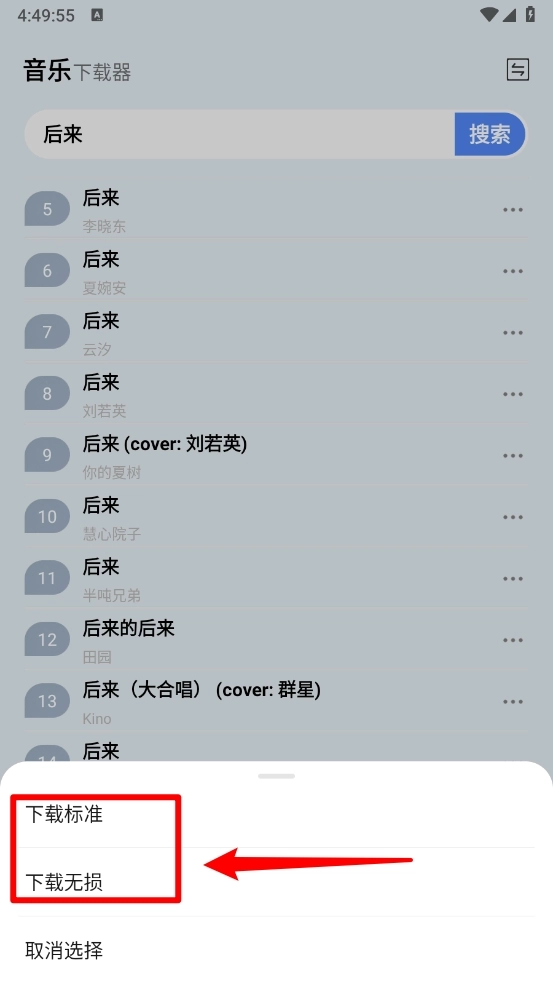 2、支持标准音质和无损音质,点击歌曲后三点图标即可选择音质。