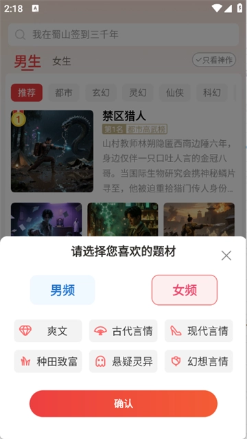 1、进入到首页选择你喜欢的小说类型以便为你精准推荐。