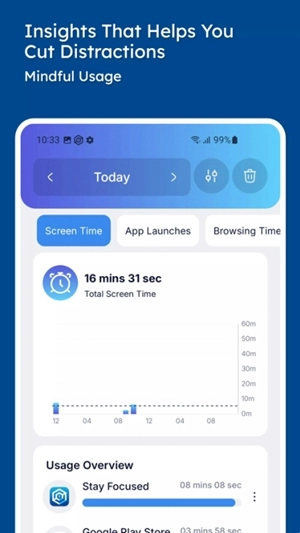 Stay Focused最新版是一款面向安卓用户的屏幕使用时间管理工具,用户能便捷查看每日、每周乃至每月的手机使用数据统计,全方位掌握各类应用的使用时长情况。要是你也乐于通过手机获取相关服务,不妨到本站体验一下!