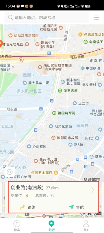 第二步:然后输入想去的地址,点击对应地址,然后可以左右滑动下方路段,进行查看附近更多的停车位。