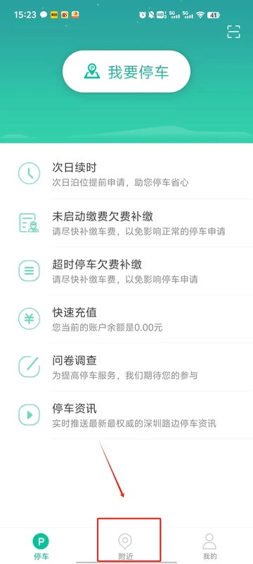 第一步:打开“宜停车”应用,接着点击“附近”选项,再点击搜索框。
