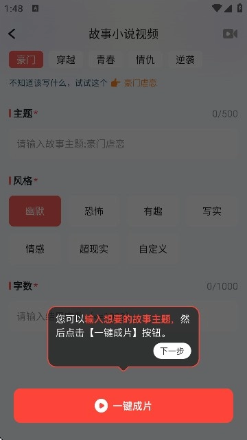 4、然后您可以输入想要的故事主题,然后点击[一键成片]按钮。