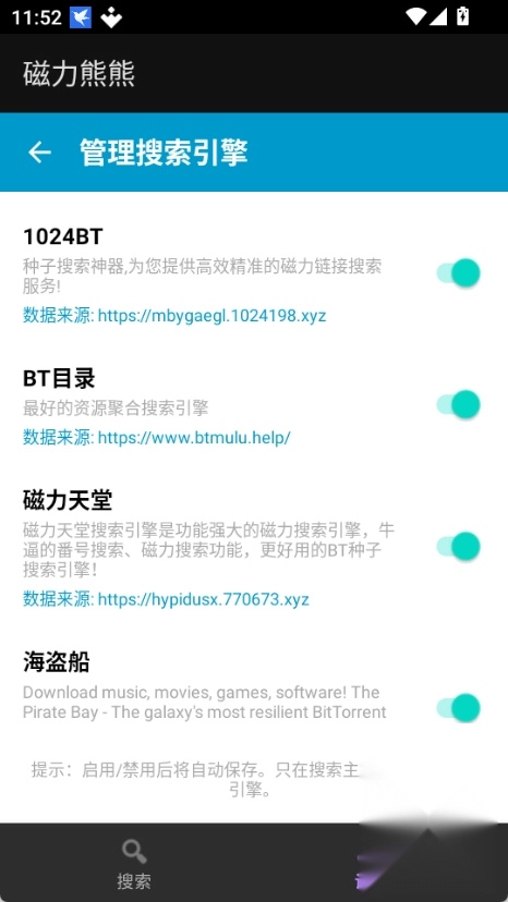 2、多个优质磁力搜索引擎,支持一键切换、启用或禁用,轻松实现全网资源聚合搜索。